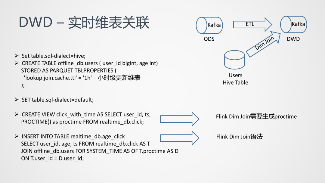 这部分是关于 Kafka 中的表如何通过 Dim join 的方式,拿到 User 表的年龄字段。图中需要关心的是 lookup.join.cache.ttl 这个参数,我们会将 user 这张表用类似于 broadcast 的方式,广播到每一个 task 中,但是这个过程中可能出现 Hive 中的 table 存在更新操作,这里的 1h 就说明,数据有效期仅为 1 小时。创建 view 的目的是将 Dim join 所需要的 process time 加上(Dim Join 需要定义 Process time 是个不太自然的过程,后续也在考虑如何在不破坏 SQL 语义的同时,简化 DimJoin 的语法。)