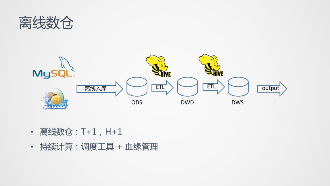 上图是一个典型的离线数仓,假设现在公司有一个需求,目前公司的数据量很大,需要每天出一个报表且输出到业务数据库中。首先是刚入库的业务数据,大致分为两种,一种是 MySQL 的 binlog,另外一种是业务系统中的业务打点,这个日志打点信息可以通过 Flume 等工具去采集,再离线入库到数仓中。然后随着业务越来越多,业务中的各个表可以做一些抽象,抽象的好处是更好的管理和更高效的数据复用和计算复用。所以数仓就分成了多层 (明细层、中间层、服务层等等),每一层存的是数据表,数据表之间通过 HiveSQL 的计算来实现 ETL 转换。