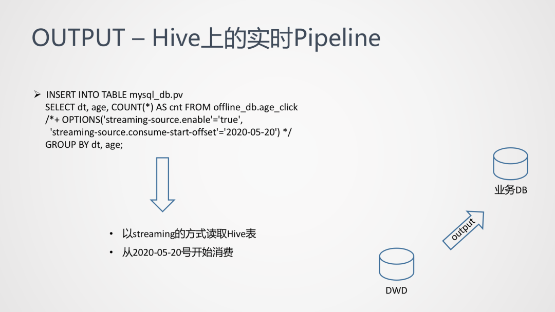 通过实时 Pipeline 的手段消费 Hive Table,而不是通过调度或者以往手动触发的 batch 作业,第一个参数 streaming-source.enable,打开流处理机制,然后使用 start-offset 参数指定从哪个分区 / 文件开始消费。此时,整个流批一体准实时数仓应用基本算是完成啦。