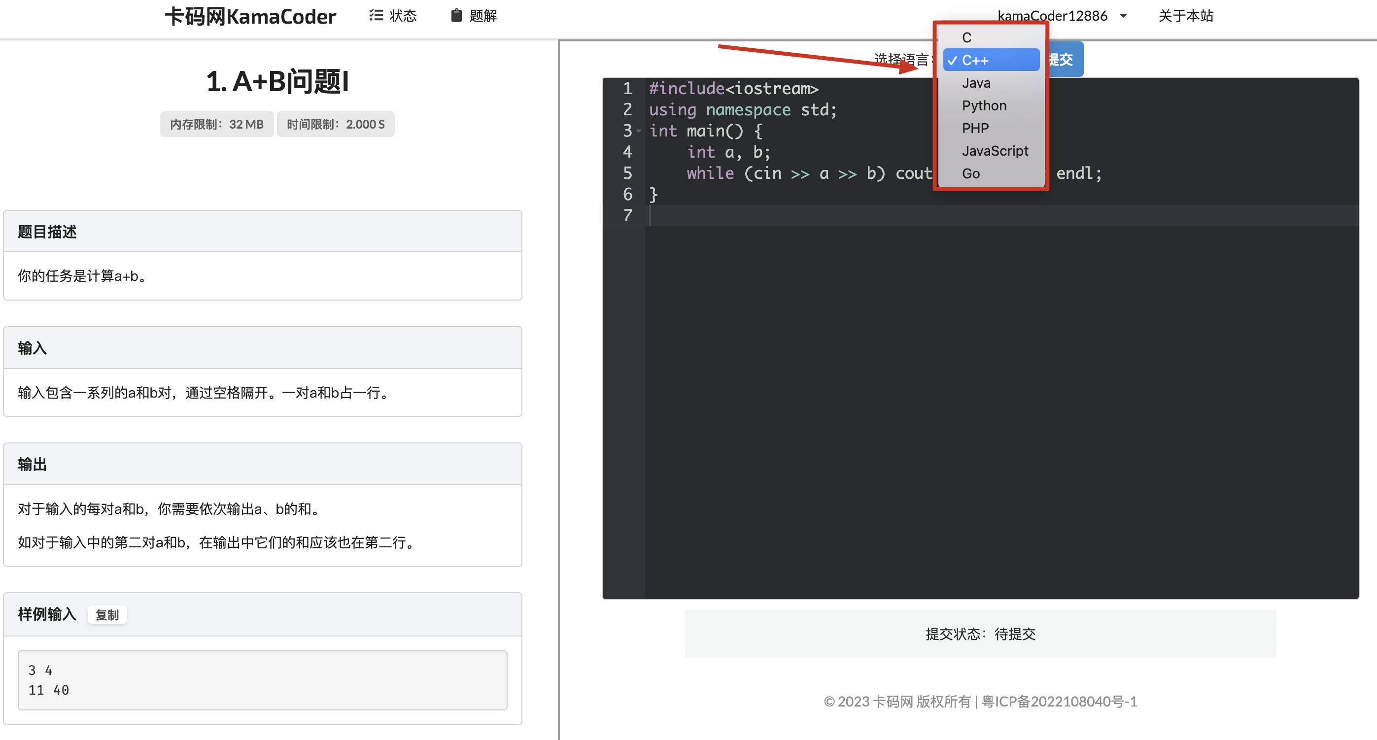 提交代码的界面是这样的,目前支持所有主流刷题语言。