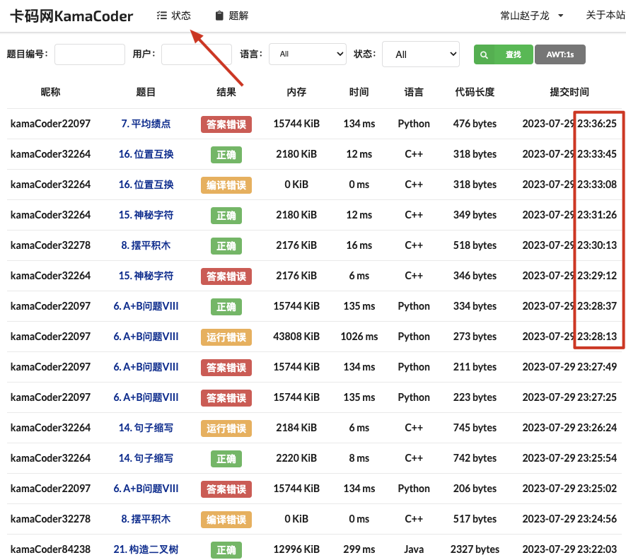 在「状态」这里可以看到 大家提交的代码和判题记录,目前卡码网(https://kamacoder.com)几乎无时无刻都有卡友在提交代码。