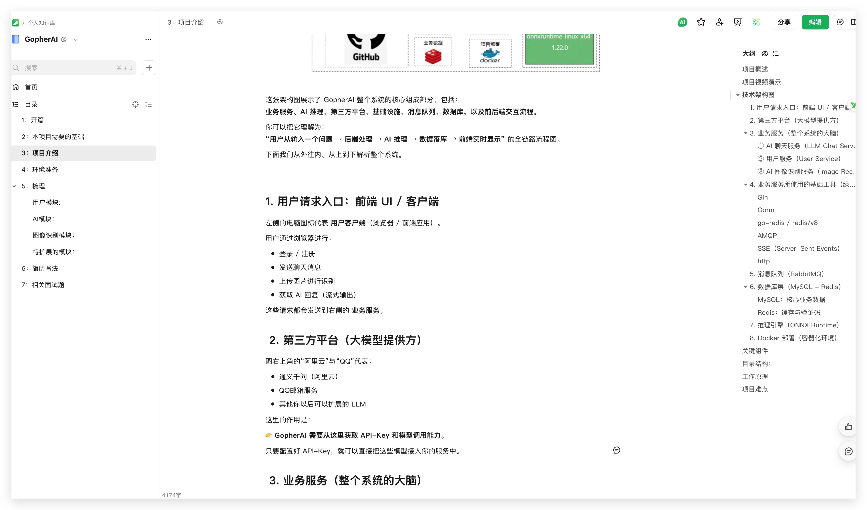 这张架构图展示了 GopherAI 整个系统的核心组成部分,包括: