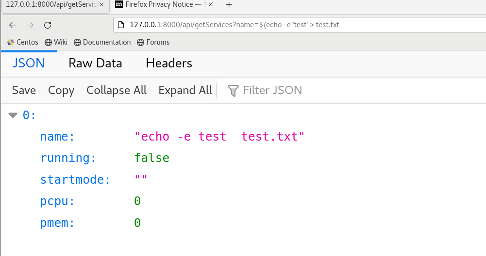 现在尝试发送这样的请求:yoursite.com/api/getServices?name=$(echo -e ‘test’ > test.txt)