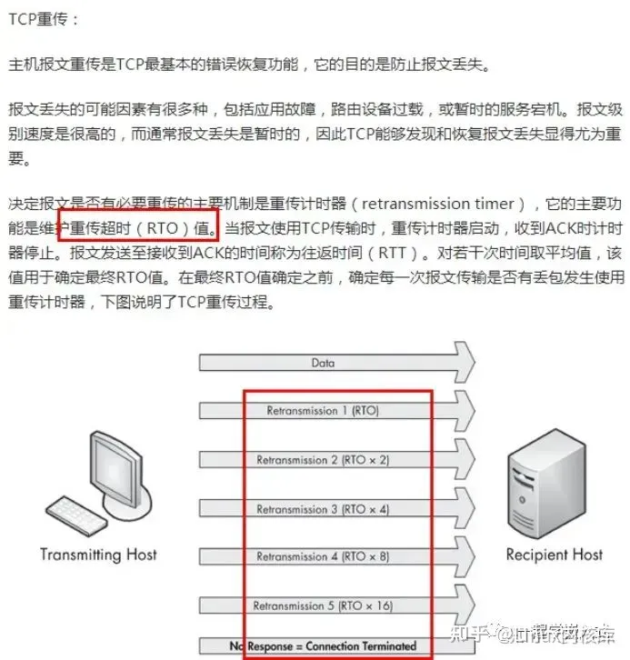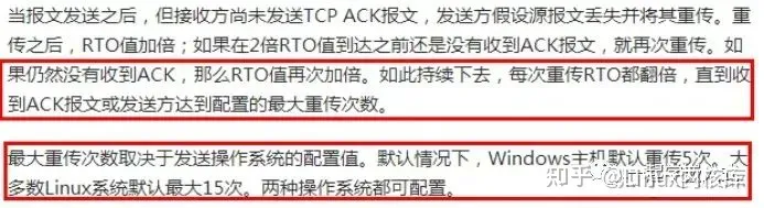 如果网络出故障时,客户端与服务器之间正在进行TCP数据交互,客户端给服务器发送数据包后因为网络故障收不到服务器的ACK包,就会触发客户端的TCP丢包重传,丢包重传机制也能判断出网络出现异常。对于TCP连接,客户端给服务器发送数据后没有收到服务器的ACK包,会触发丢包重传。每次重传的时间间隔会加倍,当重传次数达到系统上限(Windows默认的上限是5次,Linux默认的上限是15次)后,协议栈就认为网络出故障了,会直接将对应的连接关闭了。 所以当网络出现故障时有数据交互,协议栈会在数十秒内检测到网路出现异常,就会直接将连接直接关闭掉。丢包重传机制的详细描述如下所示:
