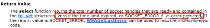 // in the fd_set structures, zero if the time limit expired, or SOCKET_ERROR(-1) if an error occurred.