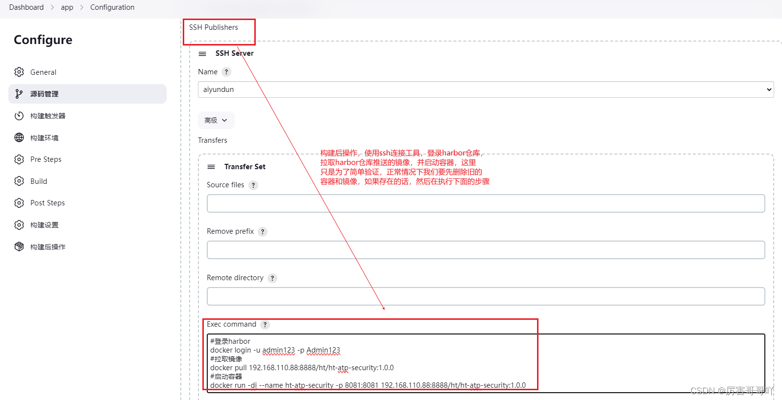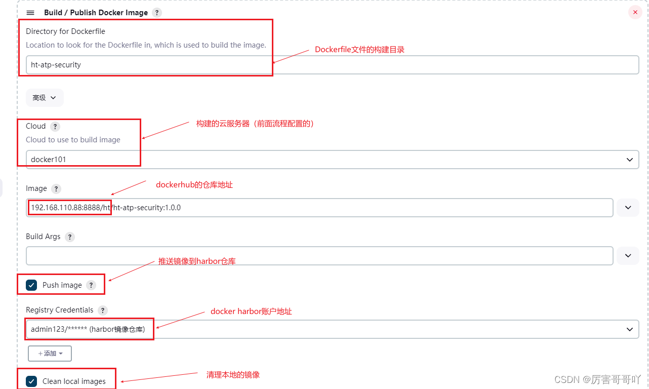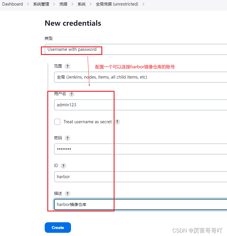 ④ jenkins凭据中配置docker harbor凭据,用于将镜像推送到harbor仓库以及拉取镜像使用,关于harbor仓库的安装,这里不做介绍,可查看作者往期博客内容
