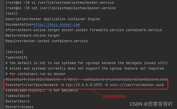 - 在docker所在服务器上的/usr/lib/systemd/system/docker.service文件中开启docker远程访问