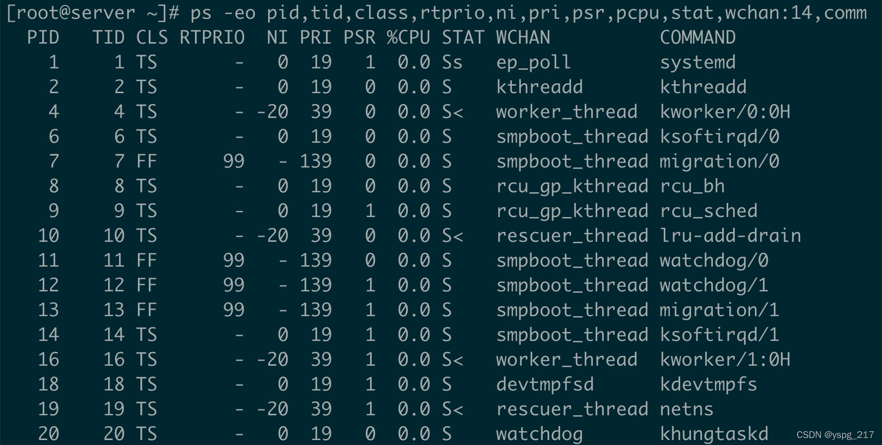 ps -eo pid,tid,class,rtprio,ni,pri,psr,pcpu,stat,wchan:14,comm