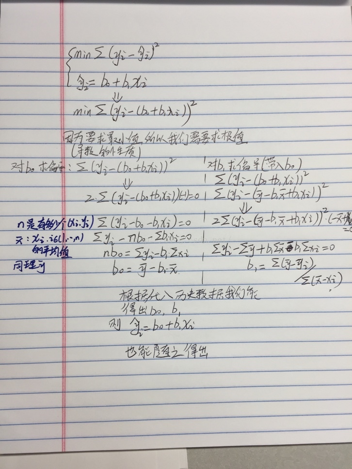 - 将 3 带入 2, 在对 b0 和 b1 分别求 偏导. 如图 (下图为错误版本,b1推导错误,感谢 qq_31442743 同学的指正, 正确版本 见 第 5 步)