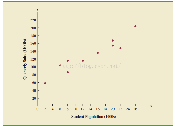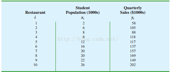 背景. 一连锁饭店的 销售额 和 坐落在它周围的 大学的 学生数量 可能有关系 所以我们对 销售额 和 学生数量 之间的关系很感兴趣.