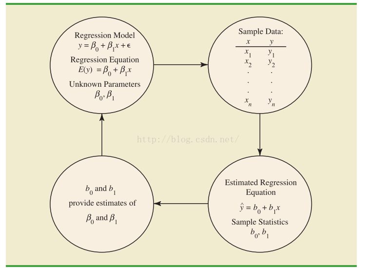 我们通过 regression model 的到 regression equation, 然后使用 历史数据 对regression equation 的参数进行优化 得到 estimated regression equation. 获得最优参数, 进行预测新的independent 数据