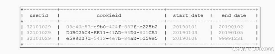 在上图中,通过拉链表记录了userid每一次关联到不同cookieid的情况。如userid为44463729的用户,在20190101这天登录某设备,在6号那天变换了另一个设备登录。其中start_date表示该记录的开始日期,end_date表示该记录的结束日期,当end_date为99991231时,表示该条记录当前仍然有效。