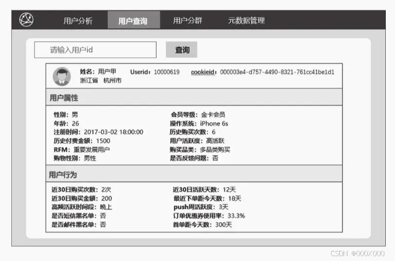 将用户身上的标签进行聚合便于查询和计算。例如,在画像产品中,输入用户id后通过直接查询该表,解析标签id和对应的标签权重后,即可在前端展示该用户的相关信息