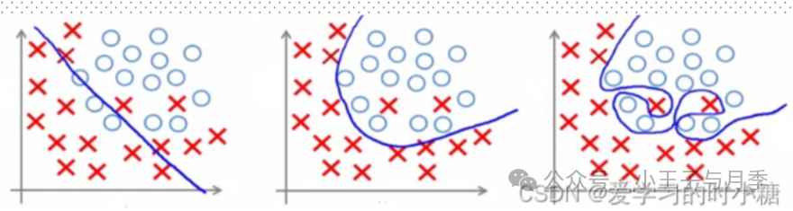 决策边界分为:线性决策边界和非线性决策边界。下图中,图1为线性决策边界,图2、图3为非线性决策边界。