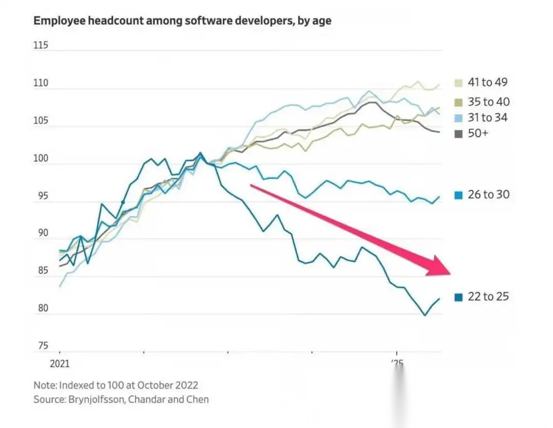 就在最近,有一个调研报告分享了随着AI的出现,年轻的程序员越来越不好找工作,尤其22岁到25岁的几乎直线下降。