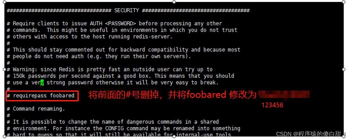设置密码,找到下面这一行#requirepass foobared 去掉注释,并修改密码为123456