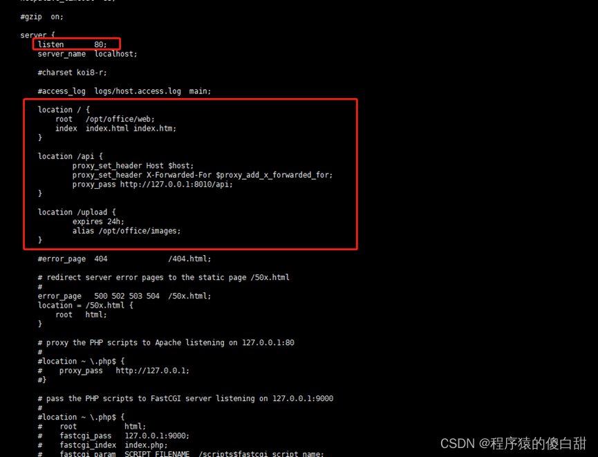 切换到 /usr/local/nginx/conf 目录下,打开nginx.conf文件;将80端口下的配置做如下修改: