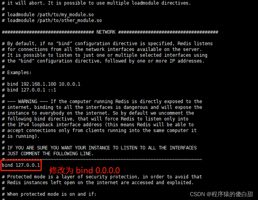 打开 /usr/local/redis/bin/redis.conf 文件,修改远程连接地址,将bind 127.0.0.1 修改为 bind 0.0.0.0