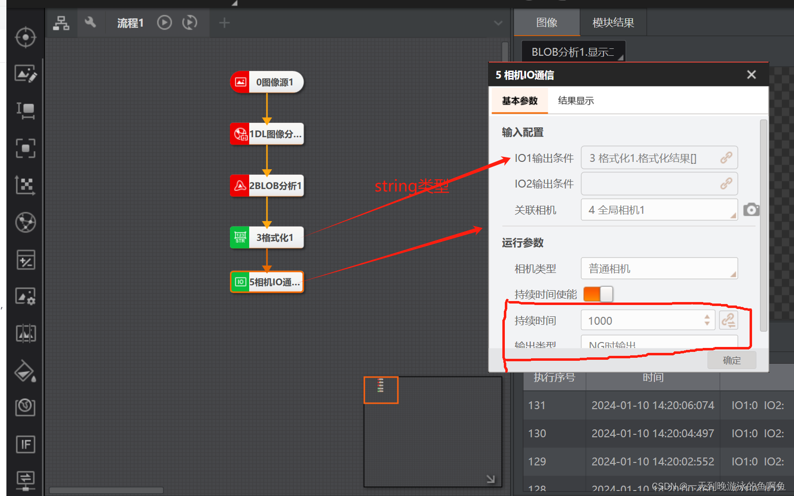 step2:相机IO通讯模块,IO输出条件只能是字符类型,因此在此模块前需要格式化的到“OK”或“NG”字符,从而控制对应的IO输出。