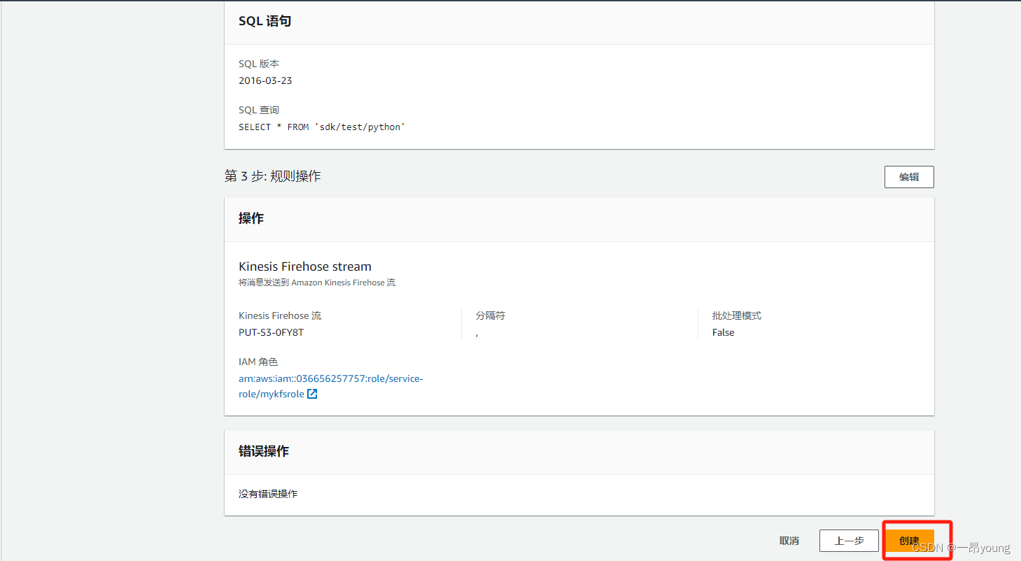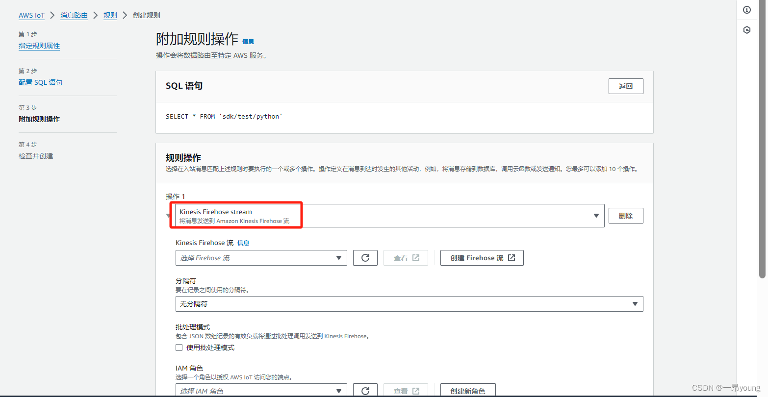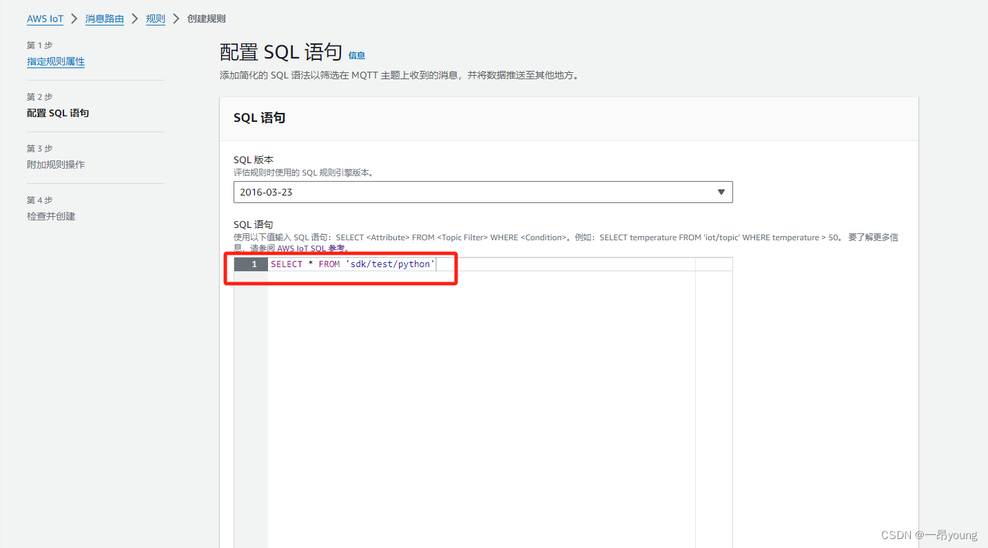 使用以下值输入 SQL 语句:SELECT <Attribute> FROM <Topic Filter> WHERE <Condition>。例如:SELECT temperature FROM 'iot/topic' WHERE temperature > 50。 要了解更多信息,请参阅 AWS IoT SQL 参考。