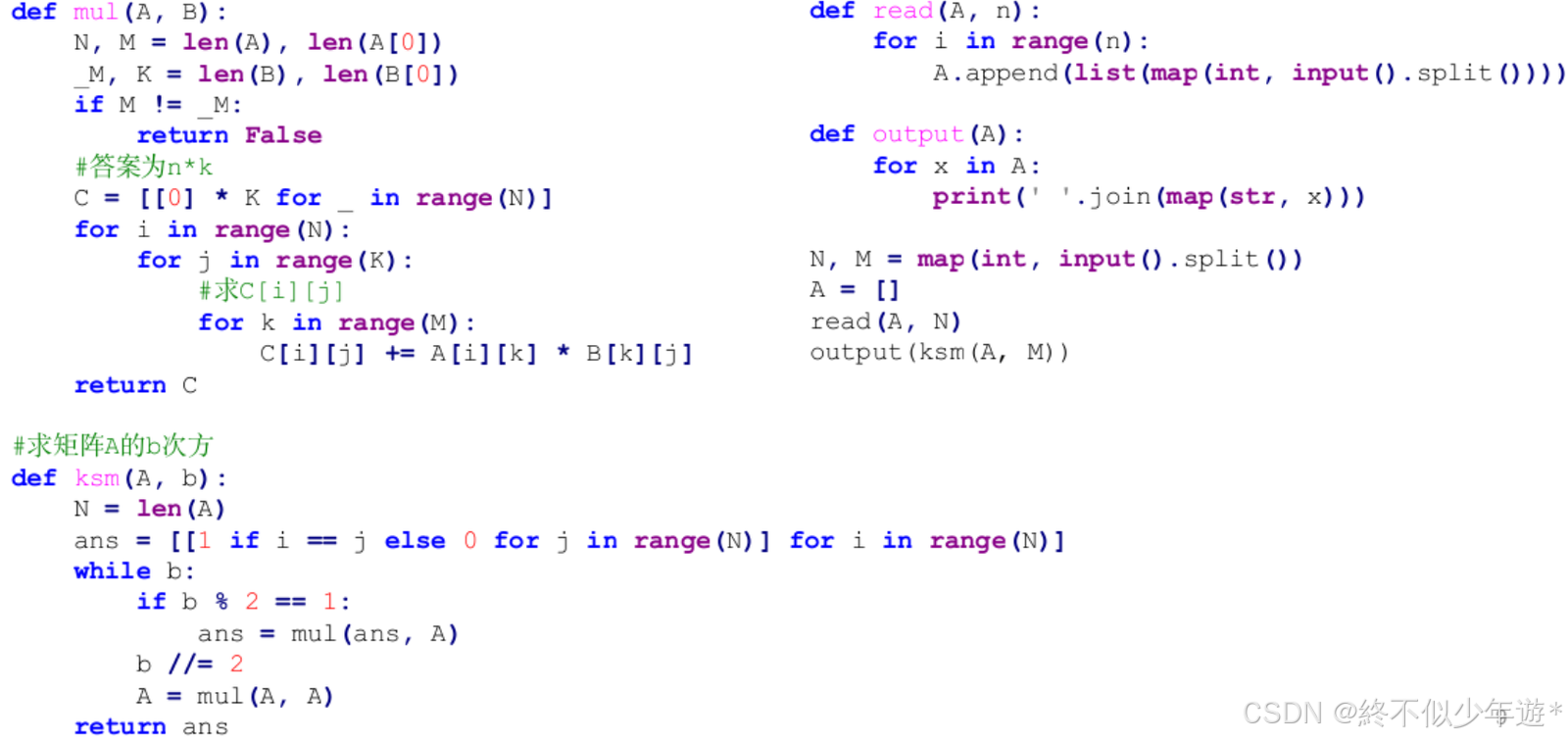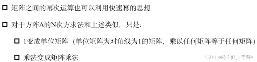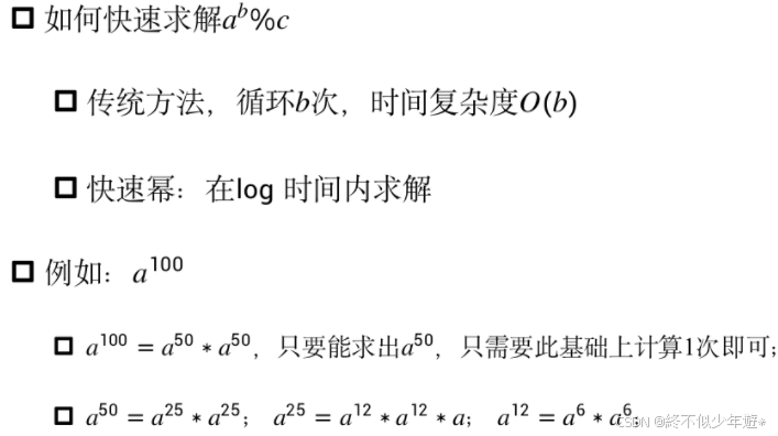 #a**100 = a**64 * a**32 * a**4是逻辑上的表现,实际代码执行时是根据指数b在非0时每除以一次2就对a倍增一次(%2=0时),或再*一个a(%2=1时);