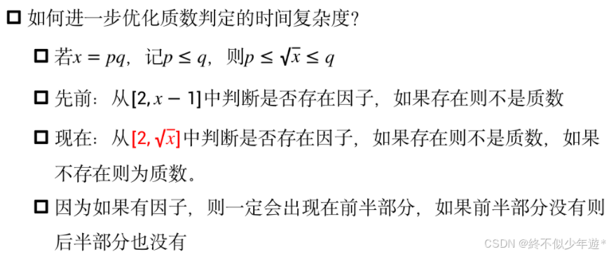 以n = 16为例,16的因数有1,2,4,8,16 。sqrt(16) = 4,可以看出当我们把判断一个 数是否为质数缩小到 [2, sqrt(n)] 是可以实现时间复杂度的优化的,1/16、2/8存在对称 性。
