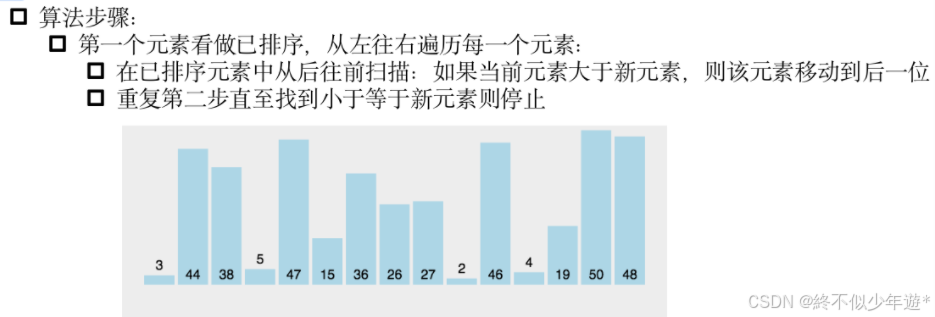 循环排序过程中,将序列逻辑上分为左半边(已排序,比对从后往前看)和右半边(未排序, 正常顺序到数组结束),新元素(右半边选到的当前待排元素)、当前元素(左半边比对到的已 排元素),左已排>右未排,左后移一位,直到右在有序的左半边找到位置(一轮结束)。