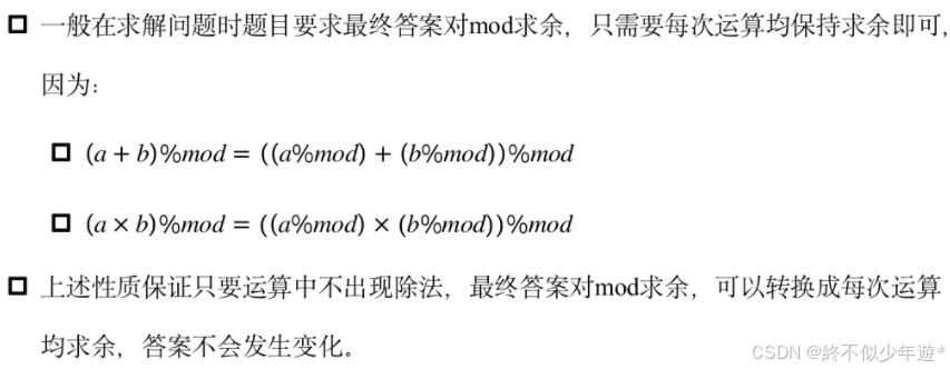 更新 base:无论 b 的最低位是否为1,base 都需要被平方,以准备计算下一个更高位的幂次方。这是通过 base = (base * base) % mod 实现的。这一步确保了 base 始终是当前考虑的幂次方的基数。