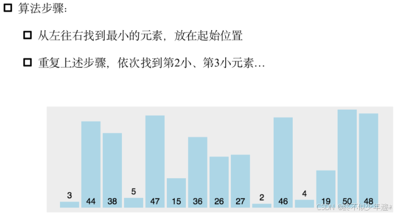 第 i 次循环:在列表的 [i, n-1] 范围内找到最小元素,并与 a[i] 交换。