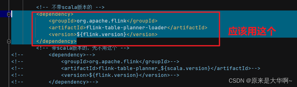 FlinkErr:Could not instantiate the executor. Make sure a planner module is on the classpath 指出Flink无法实例化执行器,并建议你确保类路径(classpath)中包含规划器(planner)模块。如果用下面(我注释掉)的这个,就必须有相对应版本的scala,但我没有scala,所以运行报错。官方说这个模块有两个,一个是带scala版本的,一个是不带的。我没注释的这个,它已经帮我把scala打到这个包里了,我就不用再操心了。