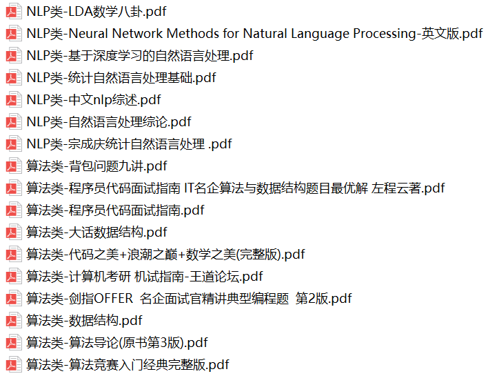 35本人工智能领域书籍大放送! 今天,算法岗从零到无穷精选35本深度学习、机器学习、自然语言处理、算法领域的经典电子书,我们将一次性统统分享给大家!只有两天,手慢无! 如何获取? 微信识别下方二维码关注,回复电子书福利,即可下载。 书籍清单 关于我们: 算法岗从零到无穷专注于算法岗的就业指导。我们的公众号主推以下几个模块: 高频面试算法题与经典算法题详解 不定期内推信息(保证是经过筛选的高质量内推信息) 各大互联网公司的真实面经 offer收割机的个人的面试心得分享 专业知识点讲解,包括且不限于自然语言处理 机器学习 深度学习等 现在就扫码关注我吧!