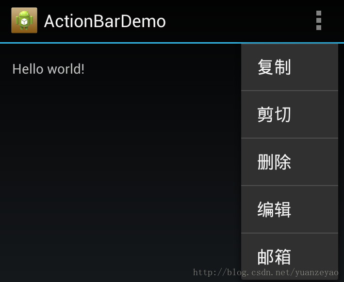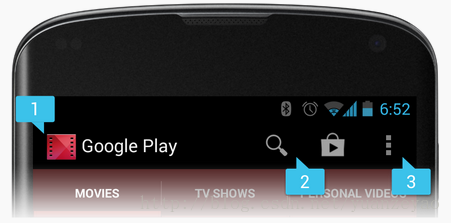 从图中可以看到一个ActionBar包括 APP icon,ActionItems,Action Overflow,其实ActionBar基本就代替了以前版本中的菜单的概念,在不支持ActionBar的App中,如果你创建了菜单,当你点击菜单键时,下方会出来菜单,而在支持Actionbar的菜单中这些菜单向就出现在了ActionItem和Action Overflow里面了(详细请见后面),有些细心同学在平时可能会发现同一款App,在有些手机上出现了Overflow,而有些手机却没有,其实这个是有规律的,在有菜单物理键的手机上是没有Overflow的,在没有物理菜单的手机上才有,其实Google一直主张Android设备去掉物理菜单键,所以相信以后大部分手机都没有菜单物理键的,所以菜单的概念也会慢慢的淡化。