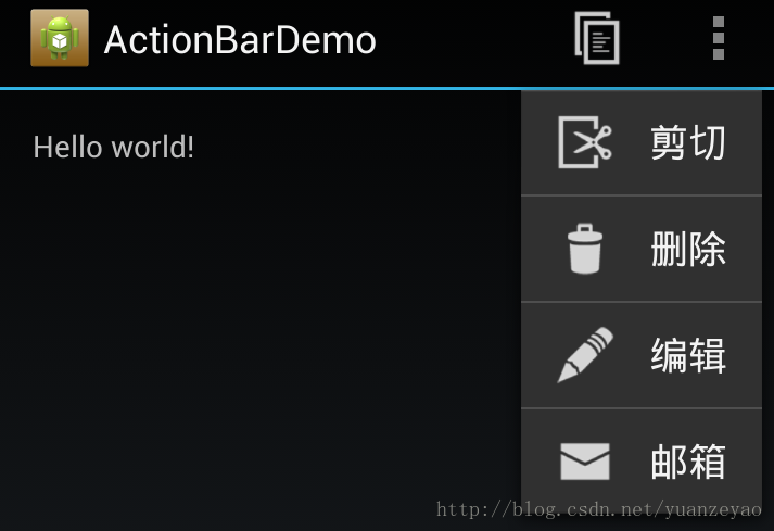 通过以上步骤,我们就已经向ActionBar中加入了5个Item,运行一下看看效果吧,如下图