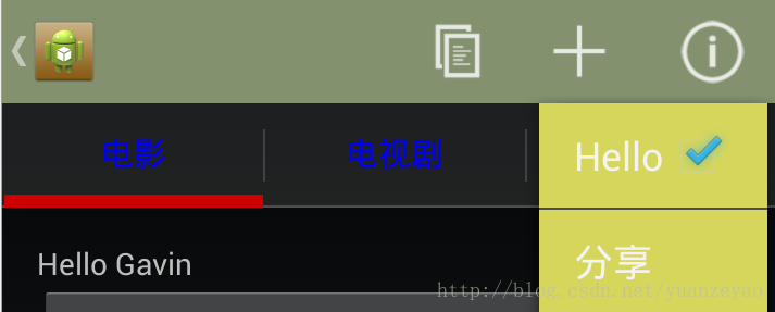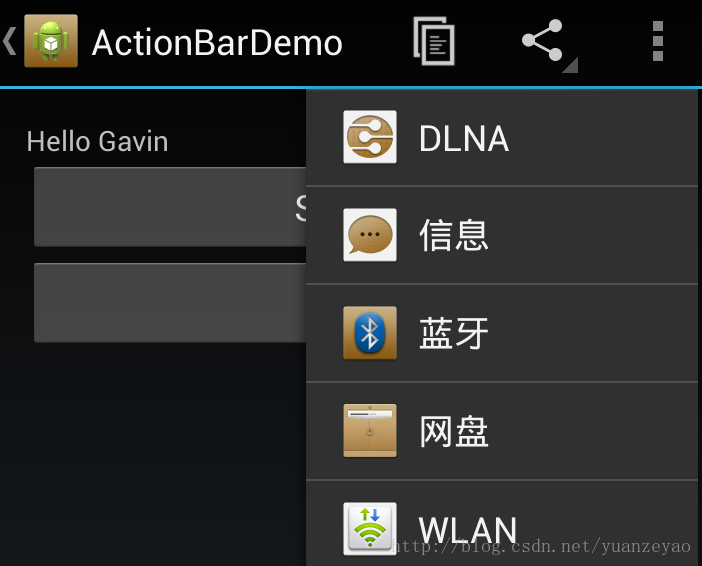 第二个问题就是设置了icon为什么没有显示?其实在Actionbar中,处于ActionItem位置的item默认是显示icon而不显示title的,我们可以通过在showAsActoin中配置"always|withText",让Tiele显示出来(但是也不一定会显示,只是尽量显示),而处于Overflow的item 默认是显示title而不显示icon的,这个可以通过反射机制来改变,方案如下: