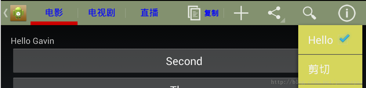 注意这里的showAsActoin命名空间是自定义的,不是"android",因为这个属性在2.x系统中没有,是andorid-support-v7定义的,你运行一下,会发现复制已经到了ActionItem的位置了