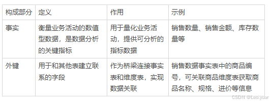 事实表主要由两部分构成,分别是事实和外键。事实就是那些用来衡量业务活动的数值型数据,也是我们进行数据分析的关键指标。像前面提到的销售数量、销售金额,这些就是事实。而外键则是用来和其他表建立联系的字段。因为在数仓里,除了事实表,还有维度表,外键就相当于一座桥梁,把事实表和维度表连接起来。比如在销售数据事实表中,商品编号就是外键,它能关联到商品维度表,这样我们就能知道每笔销售对应的商品具体信息,像商品名称、规格、进价等。