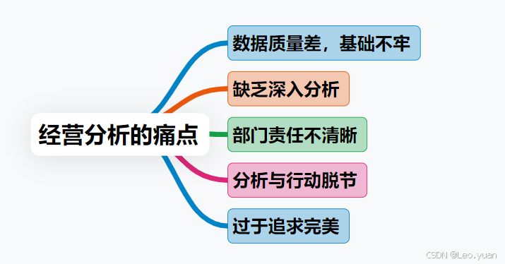 - 过于追求完美: 总想等到数据完美、分析维度100%周全再开始。结果永远在准备,永远无法产出有结论的洞察,经营分析要抓住主要矛盾,先解决80%的问题。