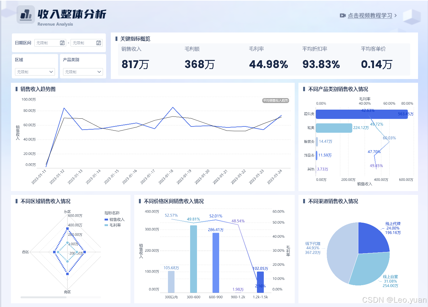 可以借助数据分析工具搭建一个可视化图表,比如我这里用的是FineBI搭建的这套销售收入分析看板图,这上面的数据直接照着上面这四个维度拆解,这样数据就很清楚了。我把这套模板放在这里,改个参数就能套用,大家可以上手试试:https://s.fanruan.com/f8rnq(复制到浏览器打开)