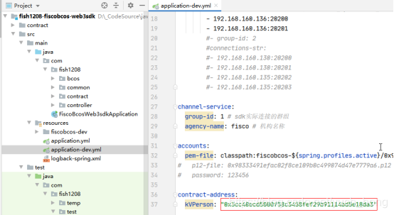 通过application-dev.yml配置文件的contract-address得到合约地址,用来加载合约,获取合约对象