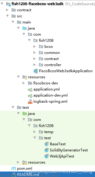 使用web3sdk api将合约转换成java文件。执行SolidityGeneratorTest的compileSolFilesToJava(),在com.fish1208.temp包下生成java文件。