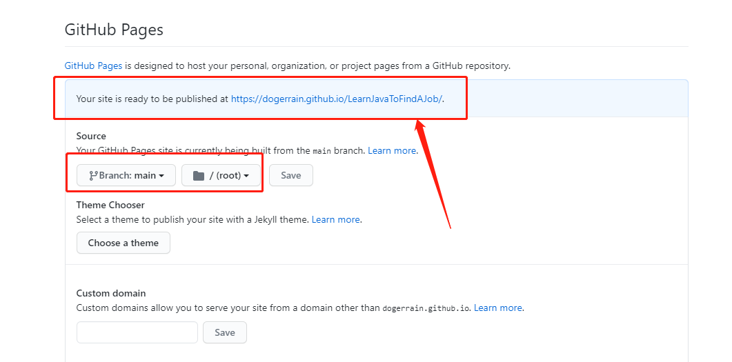 新建完成则查看仓库 的 setting,拉到最后,找到GitHub Pages,选中分支: