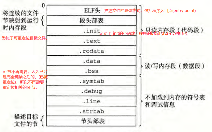 其中,ELF可执行文件被设计得很容易加载到内存,可执行文件的连续的片(chunk)被映射到连续的内存段。程序头部表(program header table)描述了这种映射关系。