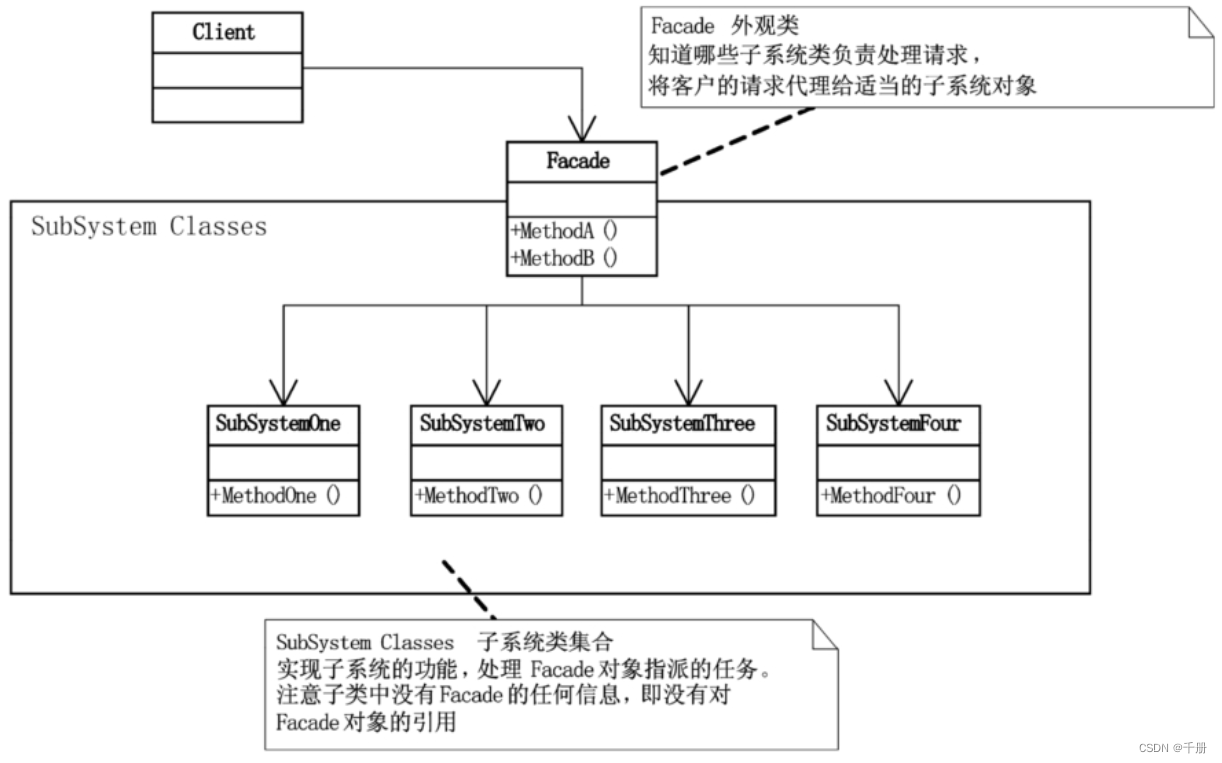 外观模式(Facade),为子系统中的一组接口提供一个一致的界面,此模式定义了一个高层接口,这个接口使得这一子系统更加容易使用。[DP]