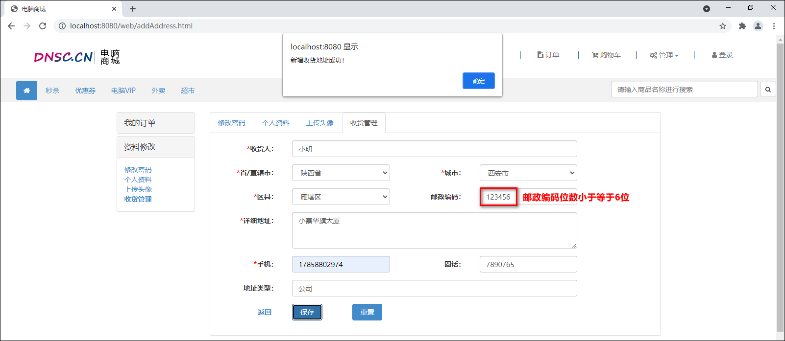 1.完成后启动项目,打开浏览器先登录,再访问http://localhost:8080/web/addAddress.html页面。输入收货人相关的信息并保存。
