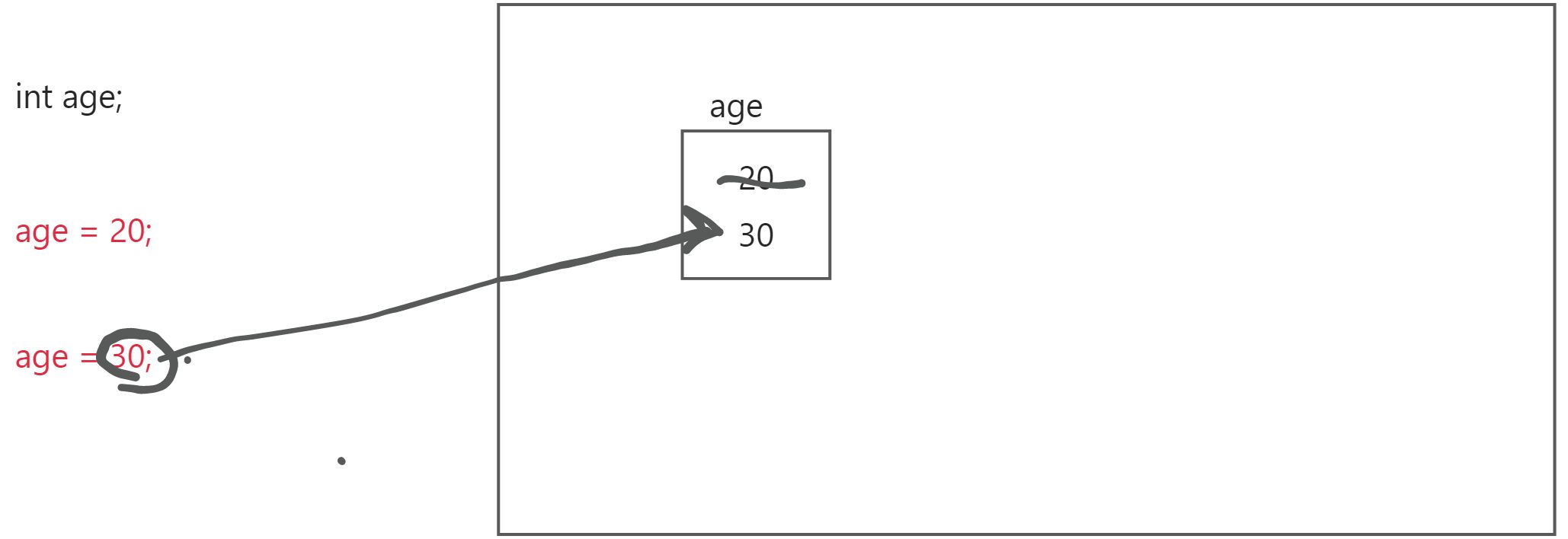 当变量赋初始化值之后,如果再给变量赋一个新值,那么这个新的值会将原来的值给替换掉