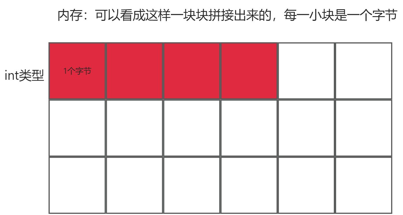 int 类型的变量,占 4 个字节,int age;可以理解成在内存中开辟了一个 4“平米”的空间