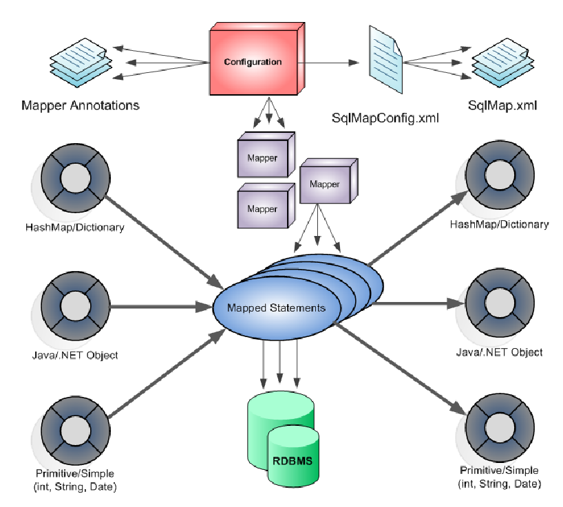 配置有两种形式,一种是基于XML配置文件,另一种是Java代码的注解,MyBatis将SQL的配置信息加载成为一个个的MappedStatement对象(包括了传入参数映射配置,执行的SQL语句、结果映射配置)并将其存储在内存中。
