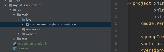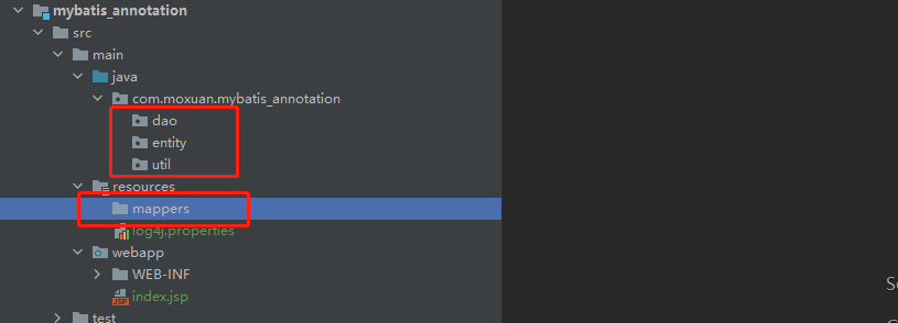 在resources目录中创建mappers目录用来存放映射文件,在项目中新建entity包和dao包分别存放实体类和映射器接口,结构如下图: