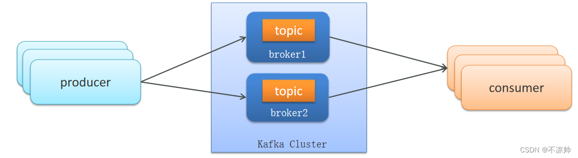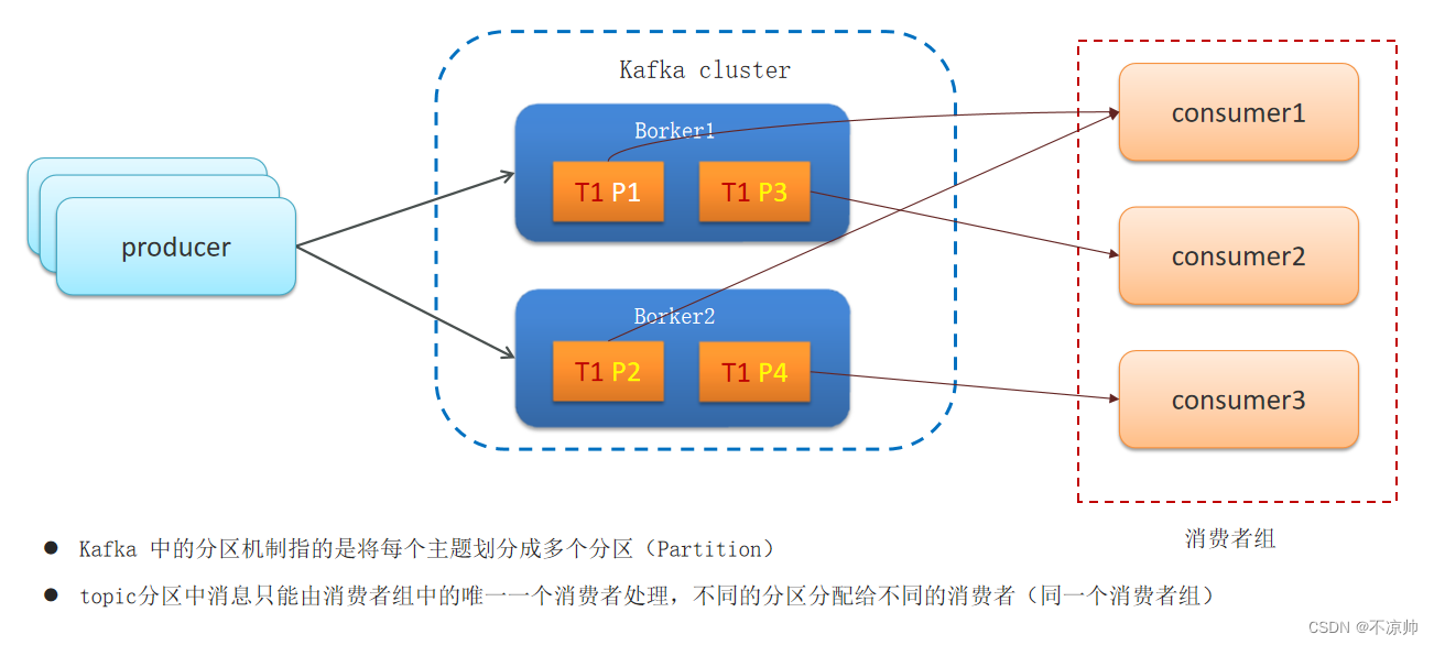 集群消费:一条消息指挥被同group的一个consumer消费,多个group同时消费一个topic时,每个group都会有一个consumer消费到数据。