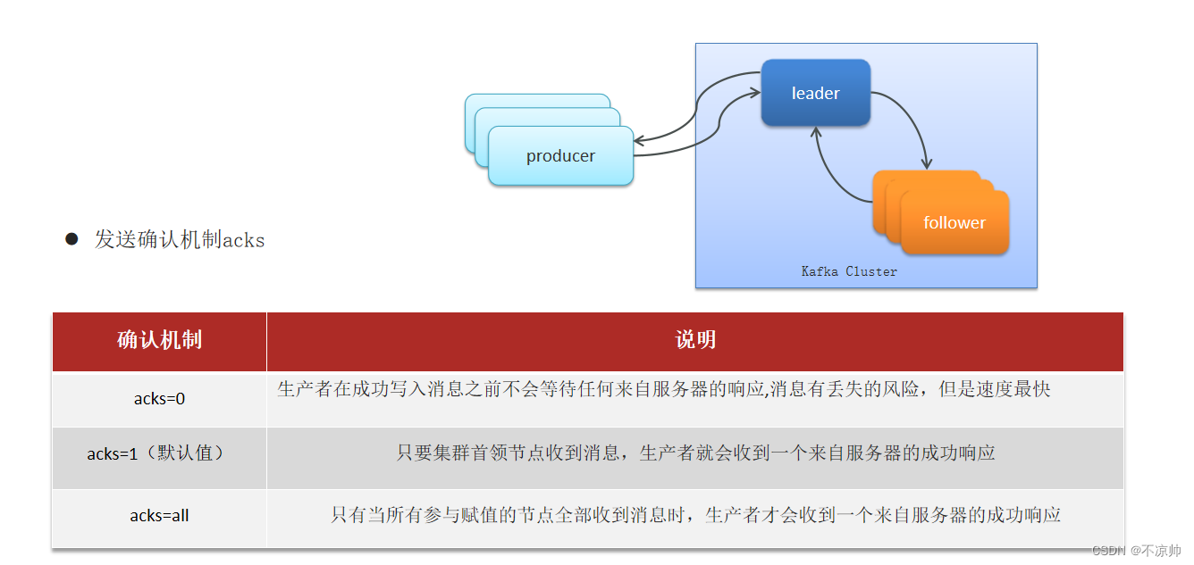 所有的分区副本的内容是都是相同的,如果leader发生故障时,会自动将其中一个follower提升为leader,保证了系统的容错性、高可用性。ISR(in-sync replica)需要同步复制保存的follower分区副本分为了两类,一个是ISR,与leader副本同步保存数据,另外一个普通的副本,是异步同步数据,当leader挂掉之后,会优先从ISR副本列表中选取一个作为leader。